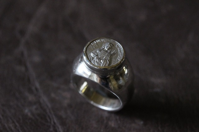 3世紀末に実在したキリスト教の女性殉教者、聖ルチアのメダイ(シルバー製)を使ったリングです。 小さいながらも精巧な彫りが施されたとても美しいメダイです。 メダイの裏面にはシルバー、製造所の刻印があります。 聖ルチアは目の病気を持つ人々の守護聖人とされ、絵画や像ではしばしば黄金の皿の上に自分の眼球を乗せた姿で描かれています。 また、「ルチア」という名は「光」を意味するラテン語 Lux に由来していることから、暗闇を照らす光の守護神とも言われているそうです。 このメダイはあえて装飾を施さず、シンプルな鏡面仕上げのシルバーリングに仕立てました。 リングサイズは約7.5号ですが、リング幅があり重量感もあるので、 着けた感じは7号ぐらいのサイズの方に合うと思います。 素材:リング・・・Silver925 メダイ・・・Silver925 サイズ:約7.5号 トップ部分 メダイ:約10㎜ リング部分の幅 約4~11㎜ ※サイズ直しは出来かねますので了承くださいませ。