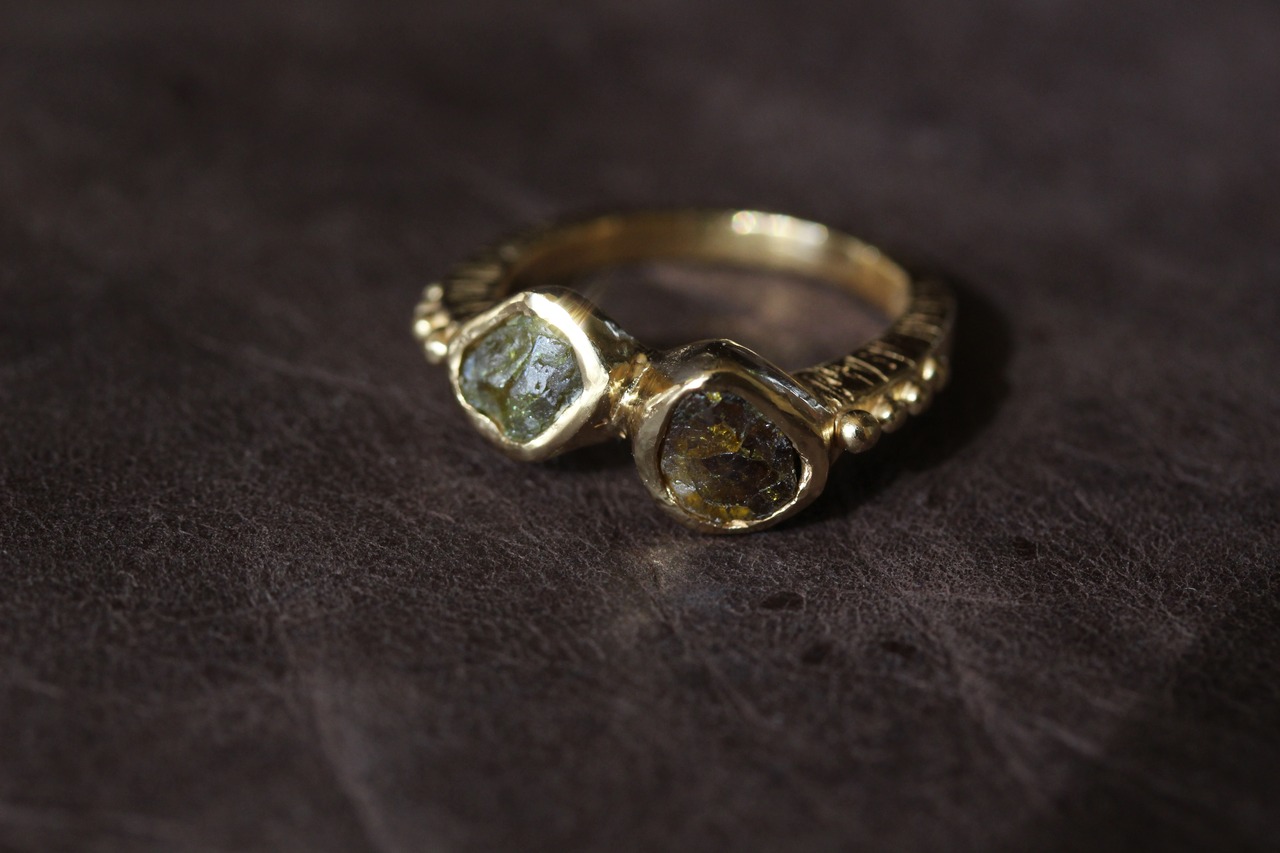 ナミビア産のデマントイドガーネットの原石を自分の手で磨き足し、宝石とは違ったゴツゴツした風合いを生かしたリングです。