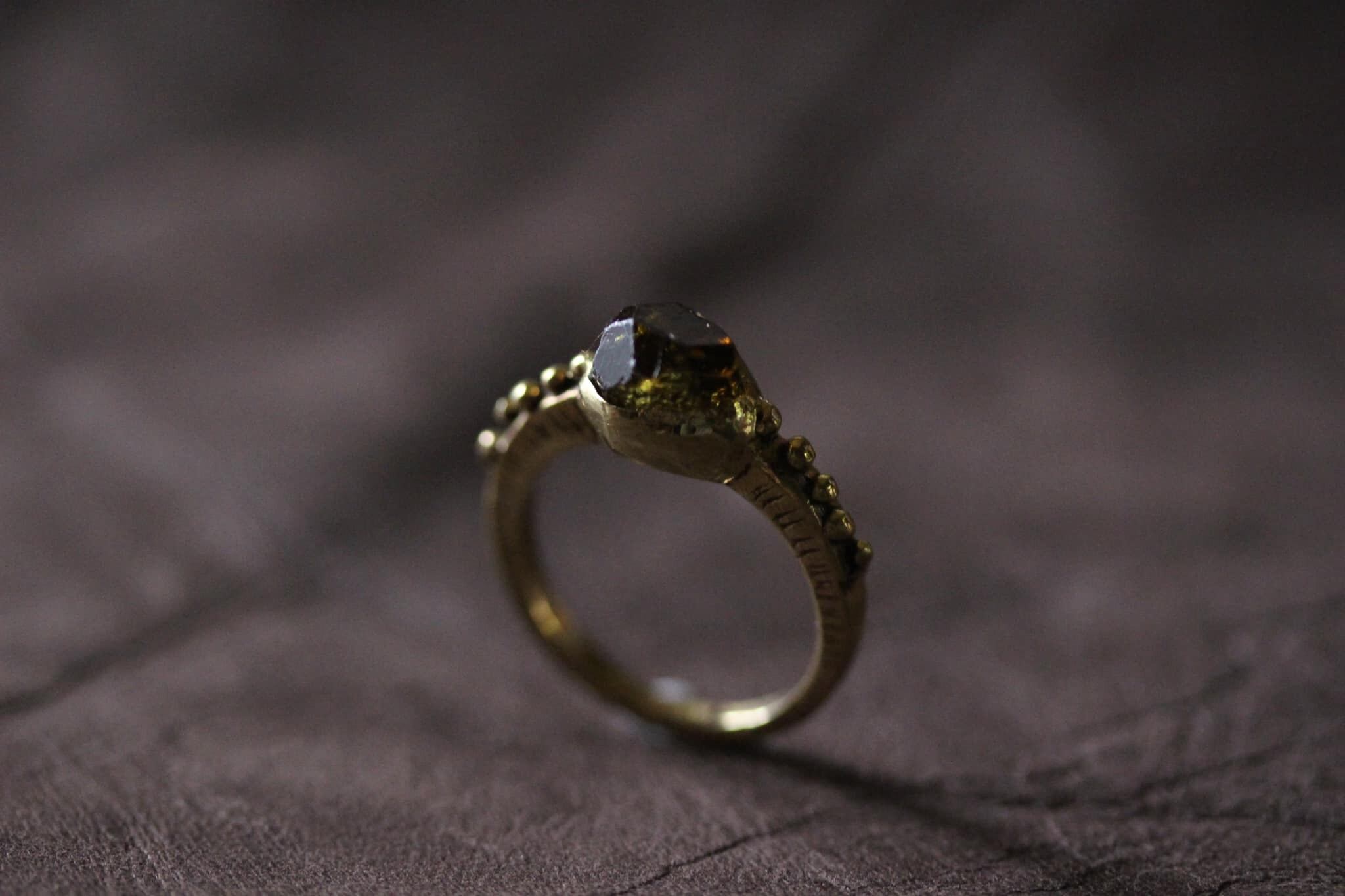 深いブラウンカラーとグリーンカラーが溶け合っているような美しいドラバイト(ブラウントルマリン)のラフカット原石をそのまま生かしたリングです。