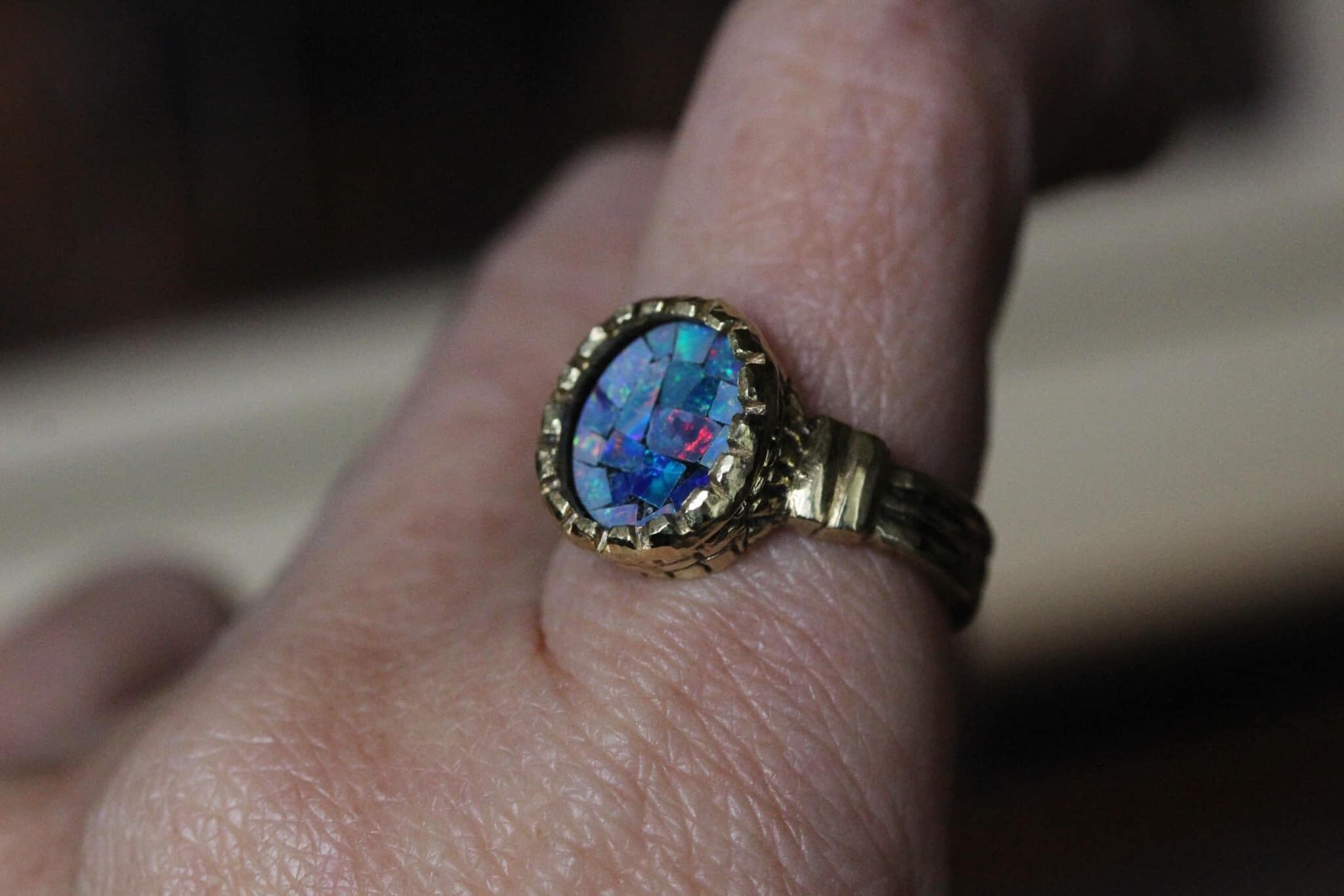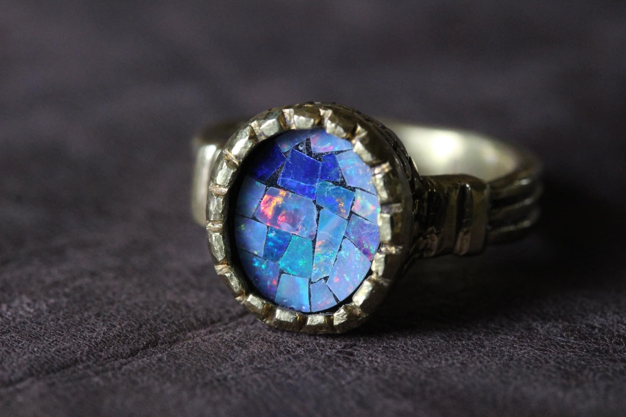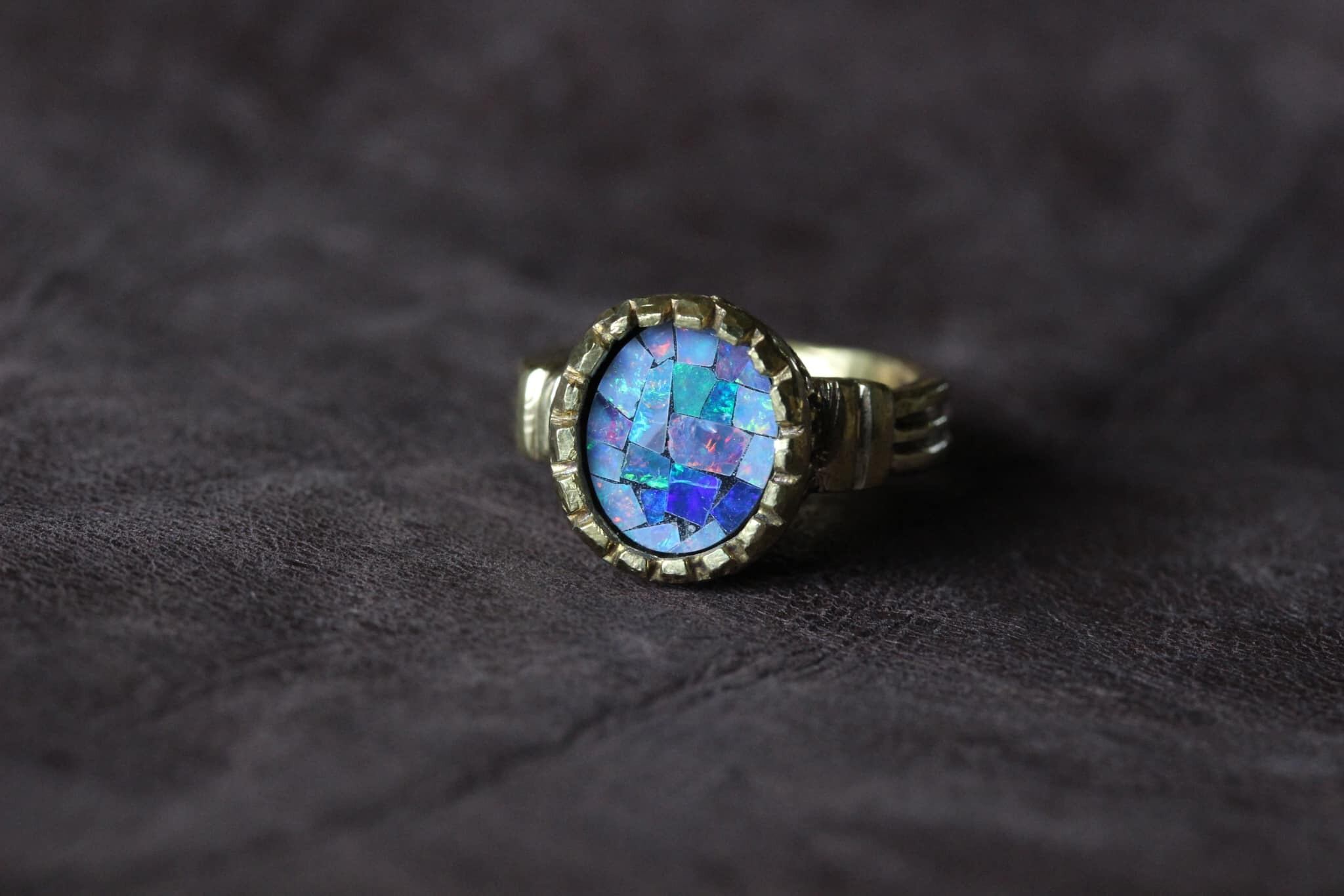 モザイクオパールの内側から輝くような青と、燻した真鍮の色が、ノスタルジックな雰囲気を醸し出しています。