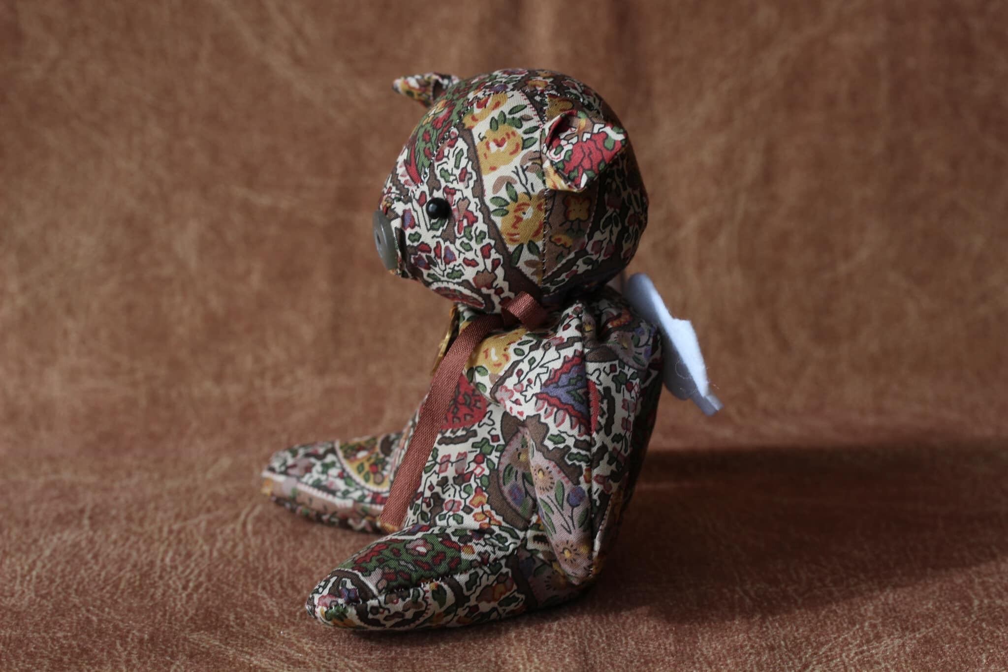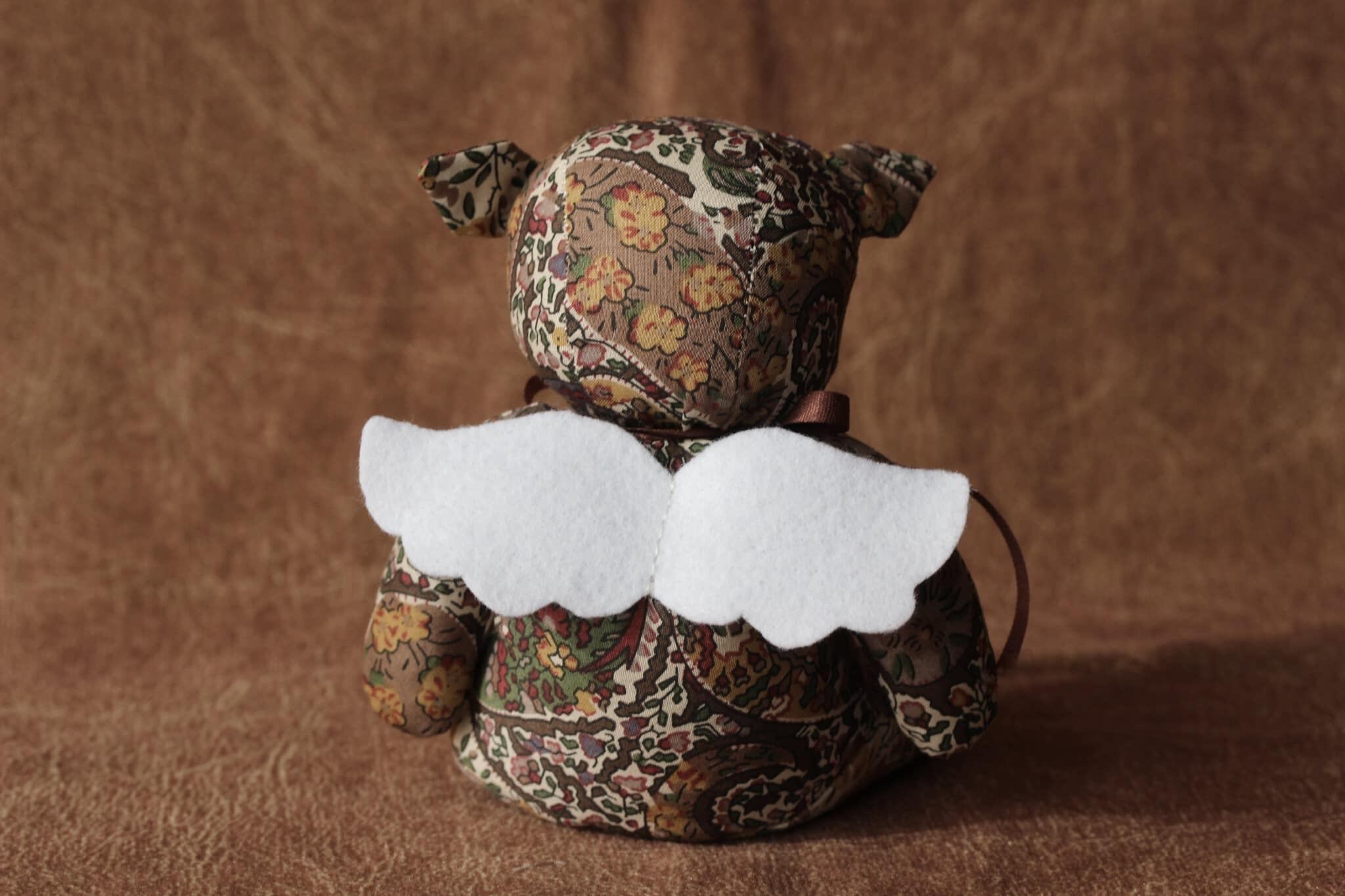 リバティプリントの生地を使用してひとつひとつ手作りした子ブタの天使のぬいぐるみです。