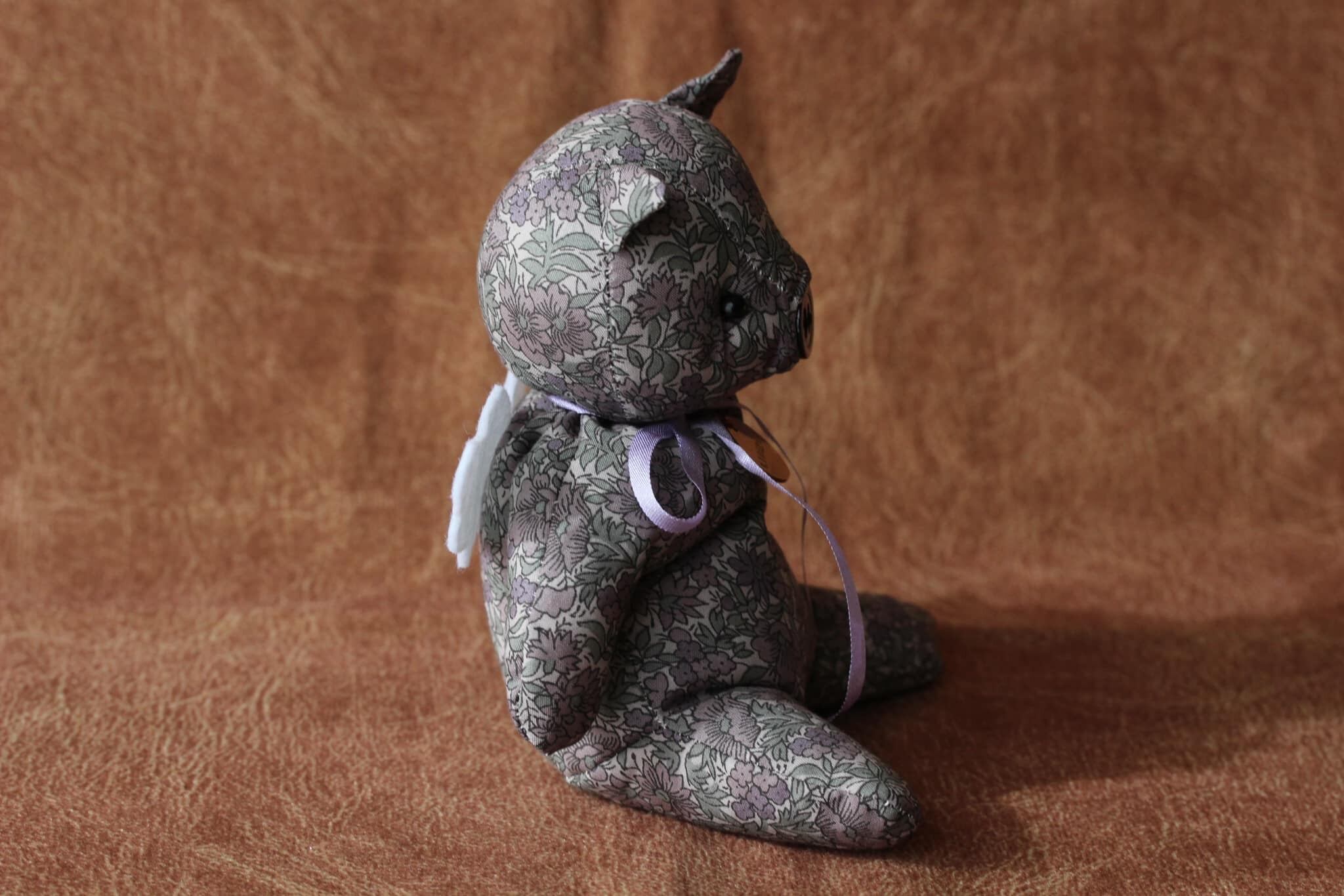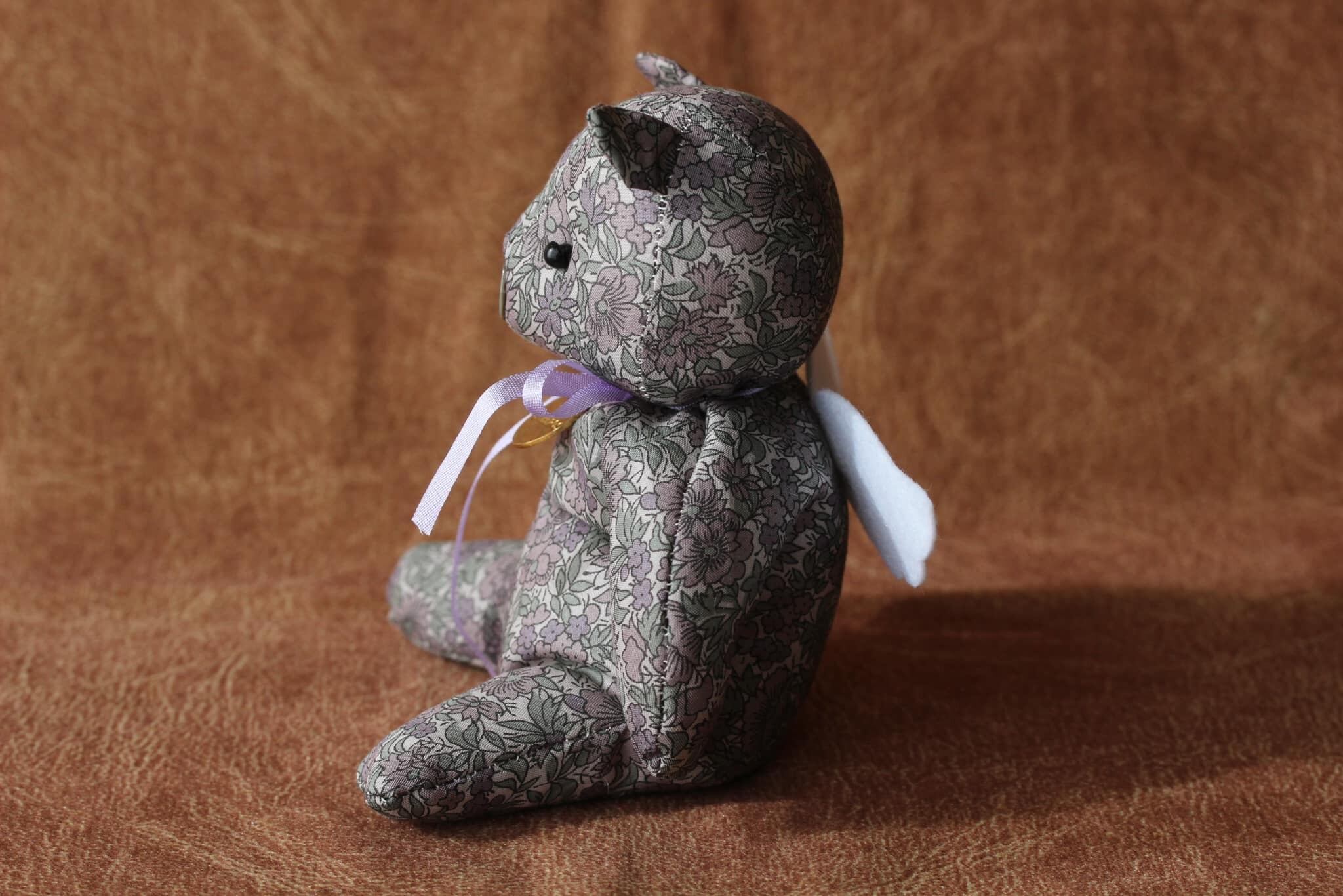 リバティプリントの生地を使用してひとつひとつ手作りした子ブタの天使のぬいぐるみです。