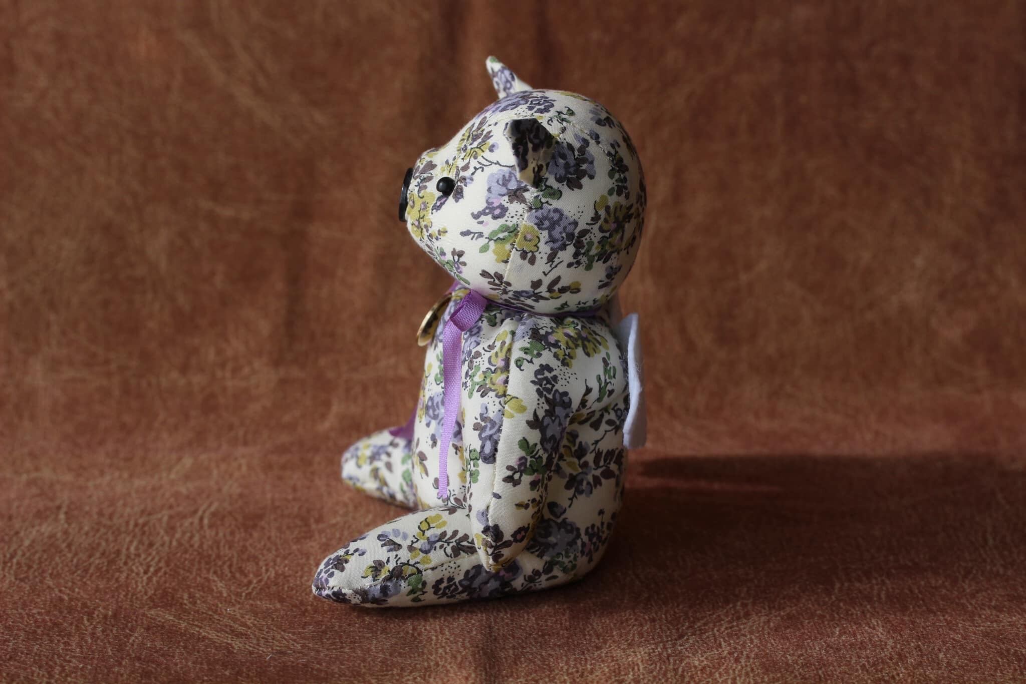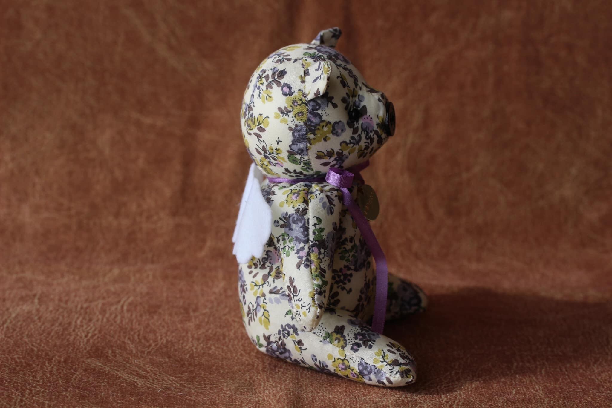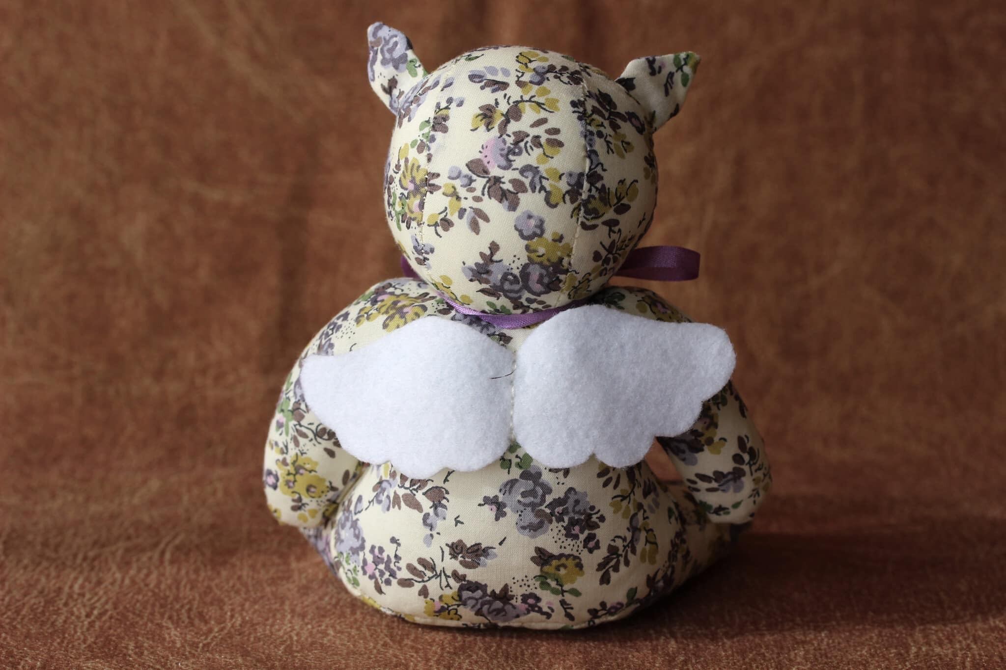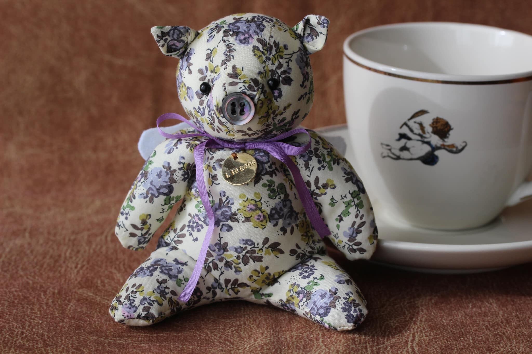 リバティプリントの生地を使用してひとつひとつ手作りした子ブタの天使のぬいぐるみです。