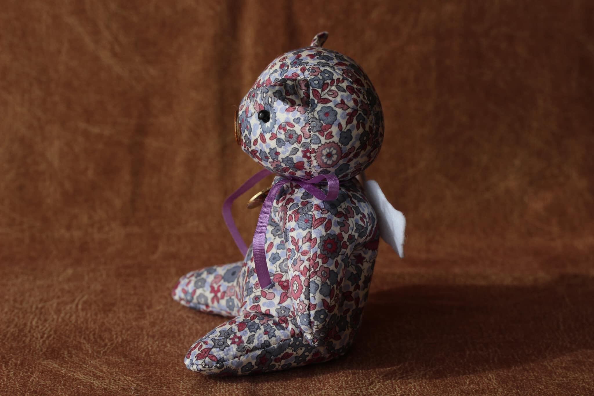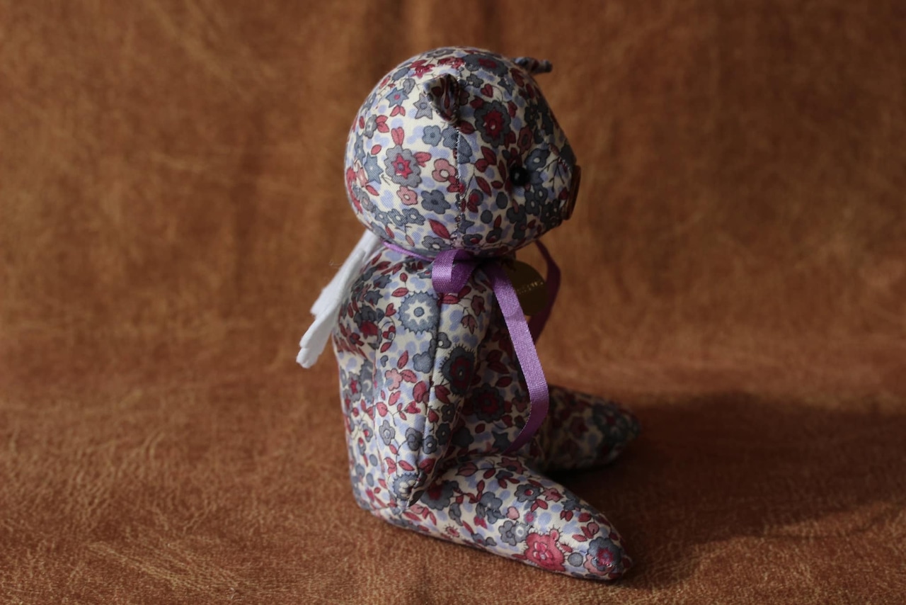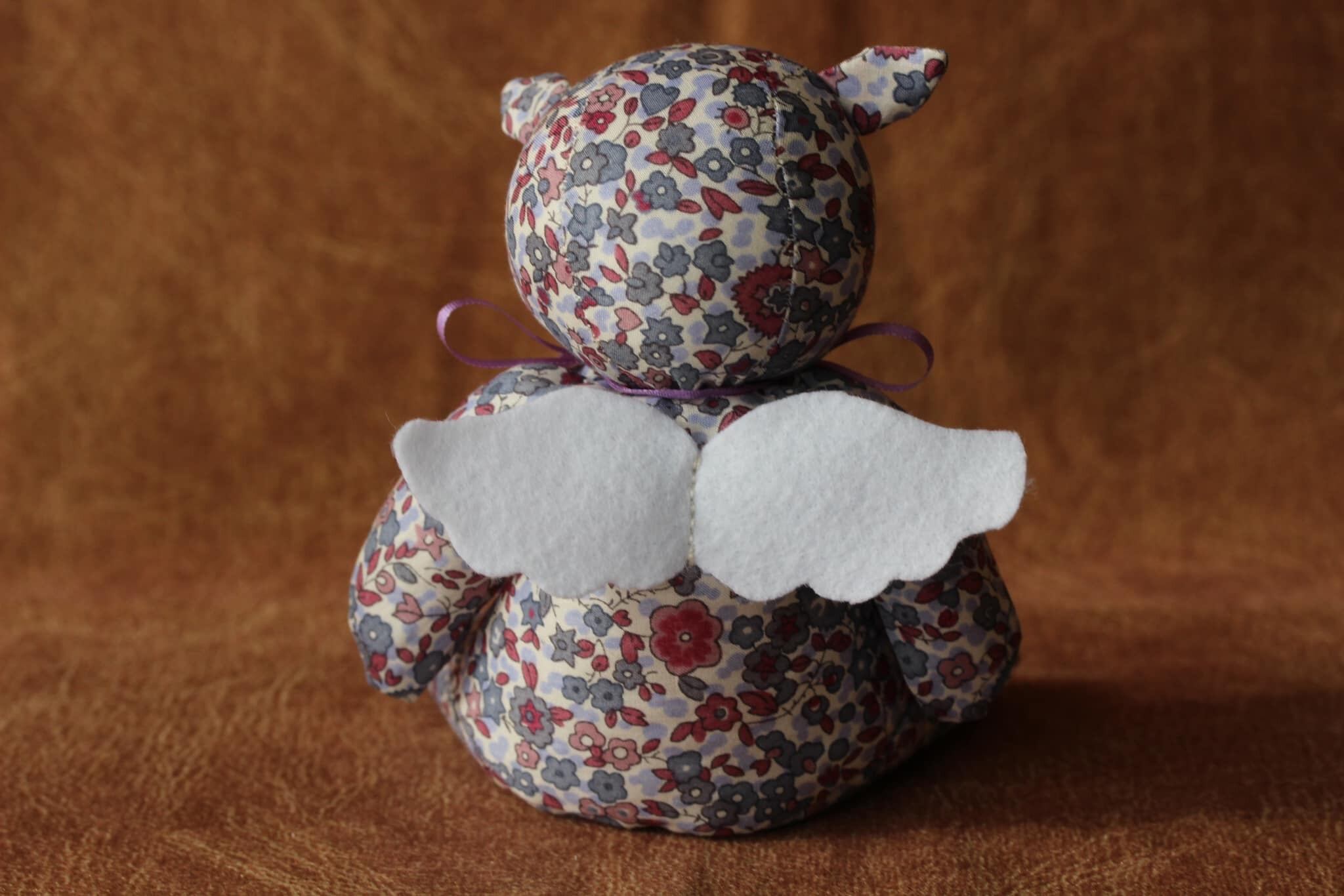 リバティプリントの生地を使用してひとつひとつ手作りした子ブタの天使のぬいぐるみです。