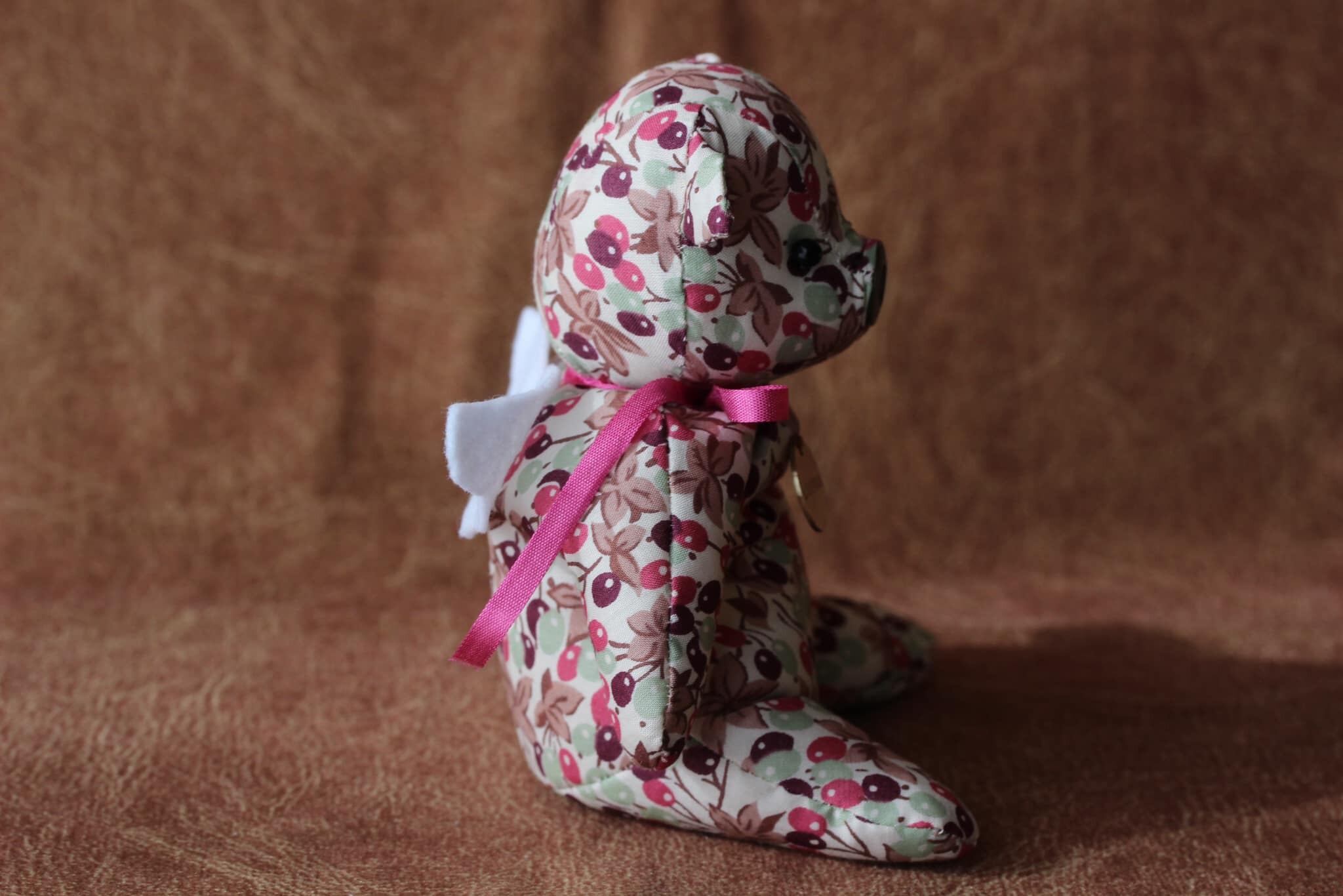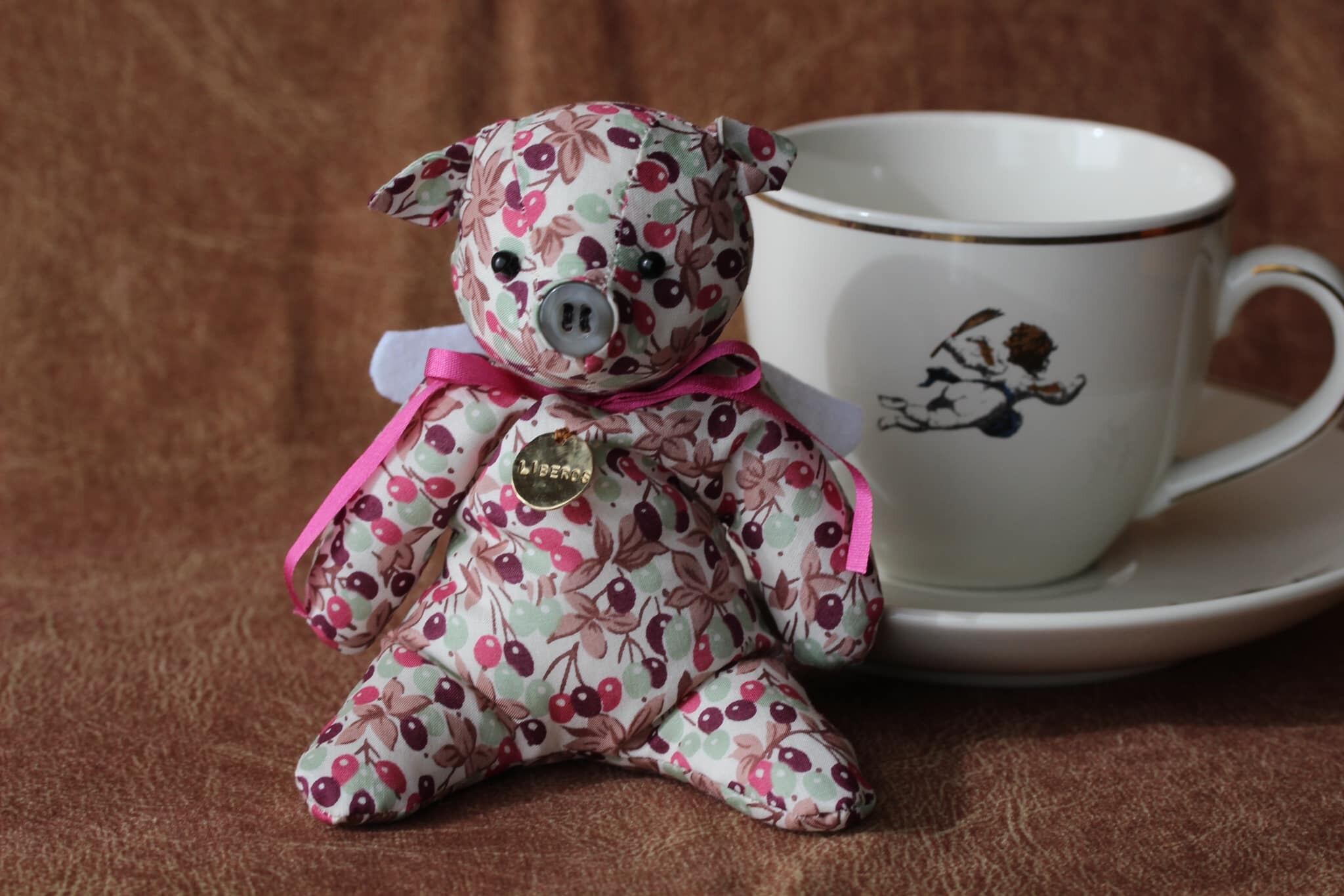 リバティプリントの生地を使用してひとつひとつ手作りした子ブタの天使のぬいぐるみです。