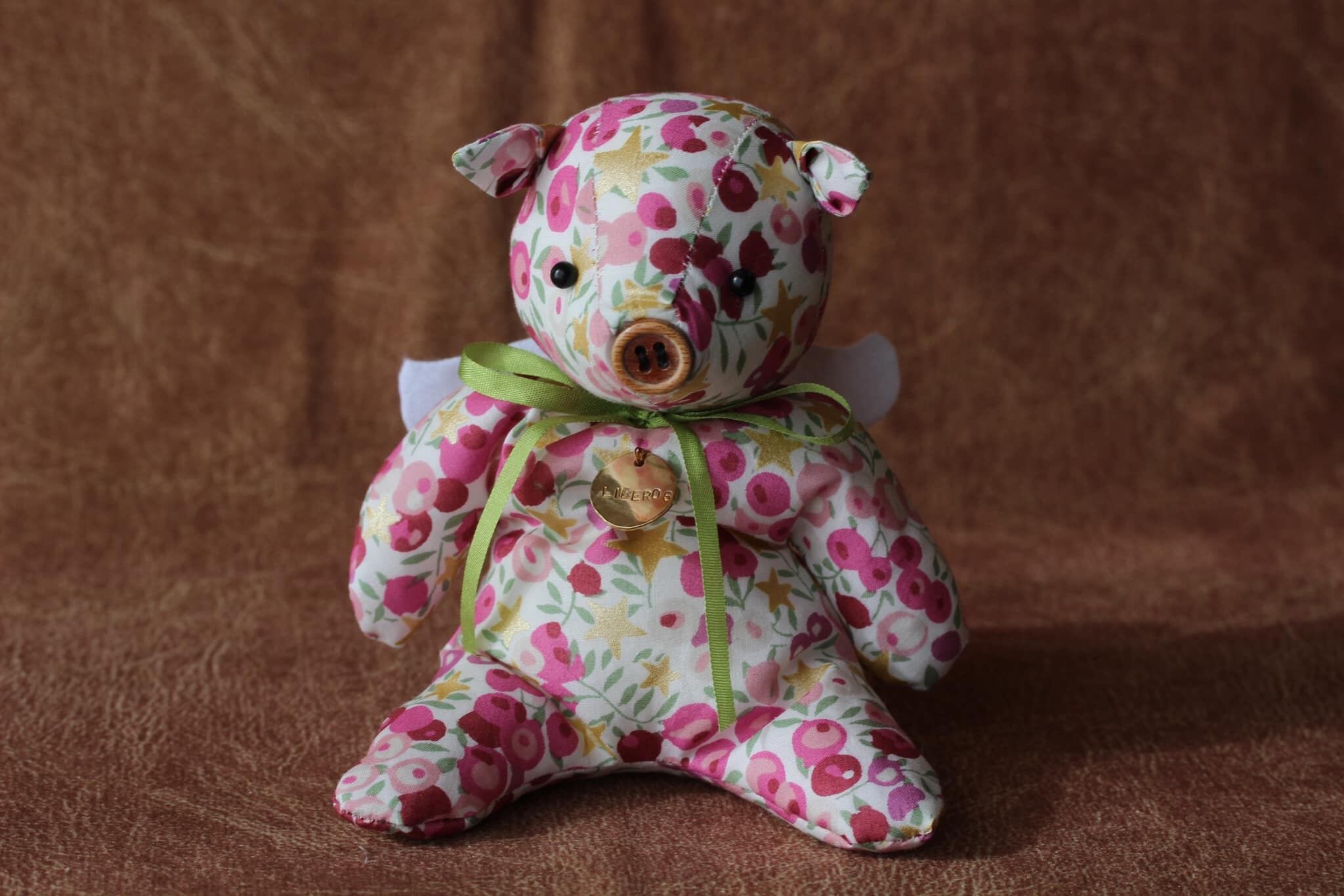 リバティプリントの生地を使用してひとつひとつ手作りした子ブタの天使のぬいぐるみです。